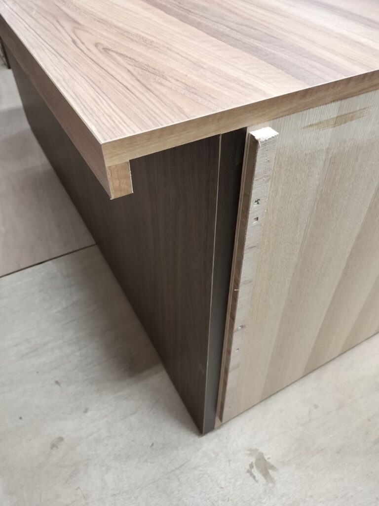 検品の中で、天板のメラミン化粧板が気温差によって少し伸びている箇所を見つけました。