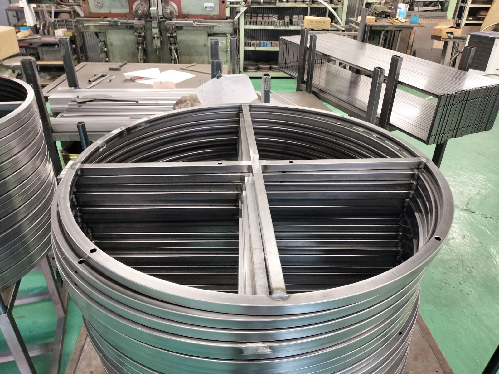 上下のフレームは、ベンダーという機械でスチールパイプを円形に曲げて製作しています。