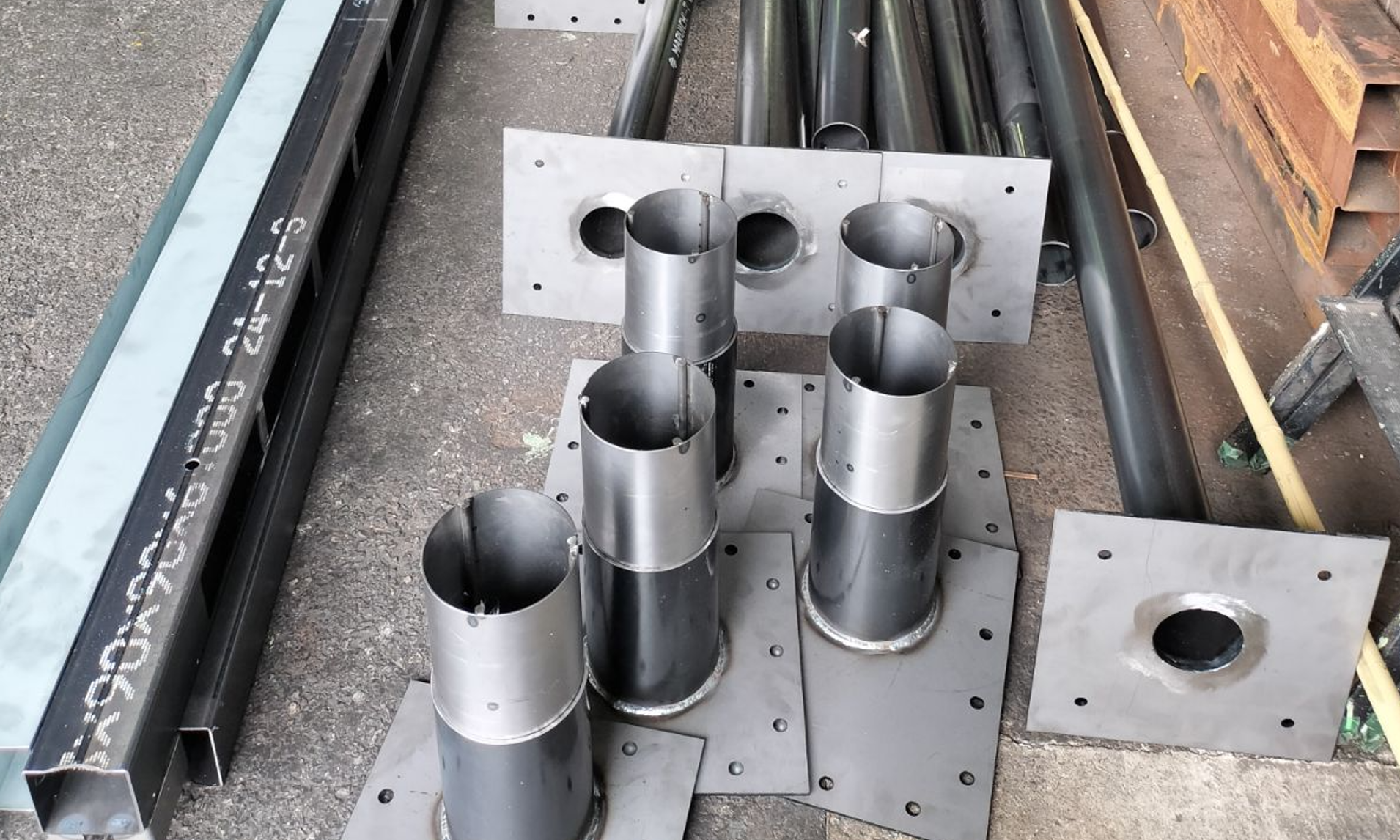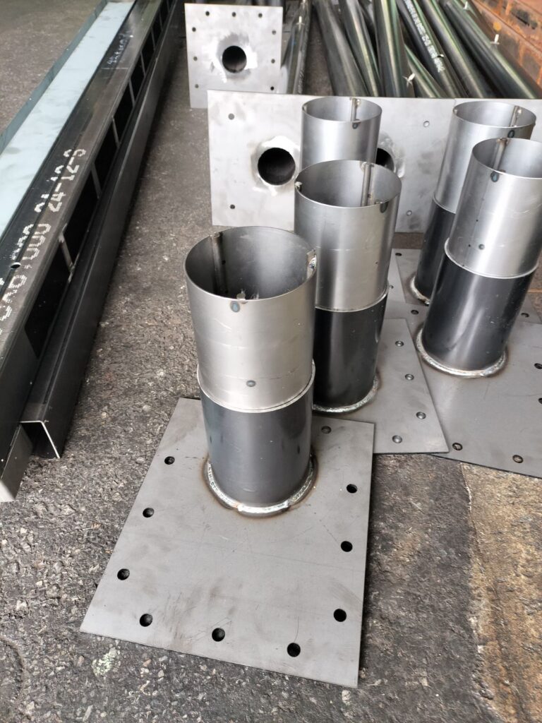 協力工場では、レーザーカットしたベースプレートにパイプを差し込み、根元部分を全周溶接する工程が進行していました。