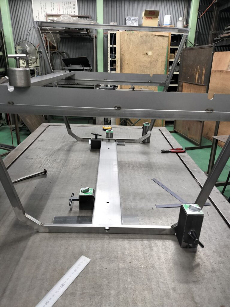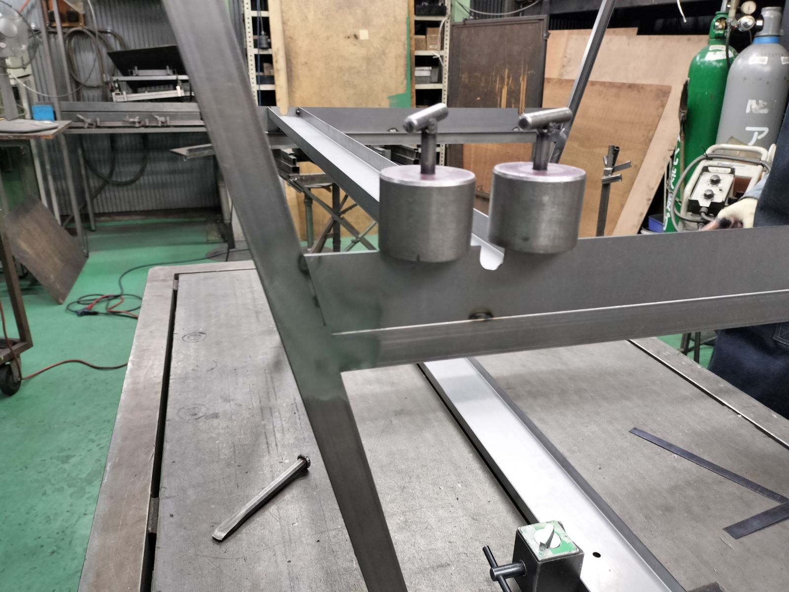 スチールは溶接熱でどうしても歪みが出るので、対角線の順番で仮付け → 寸法確認 → 本溶接