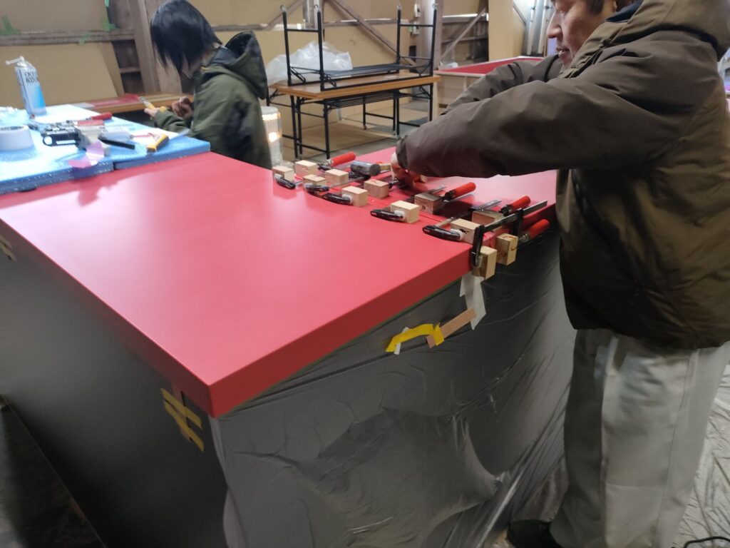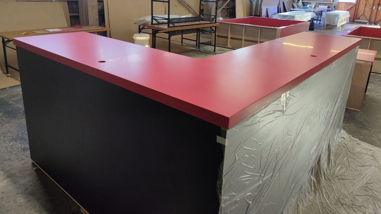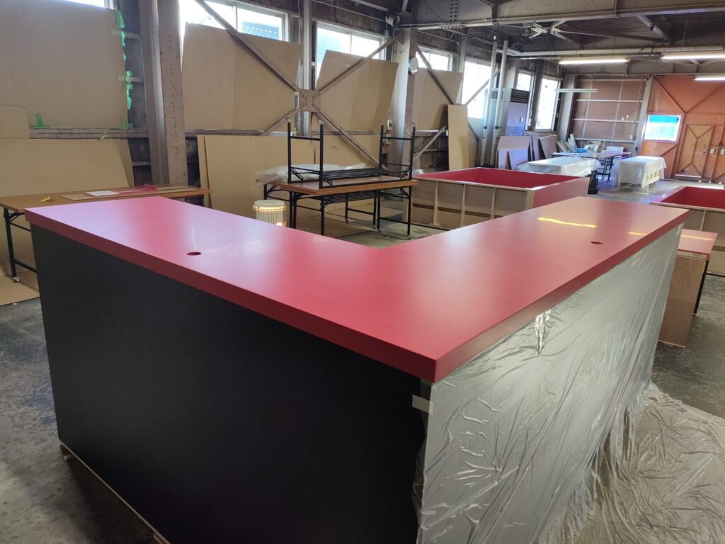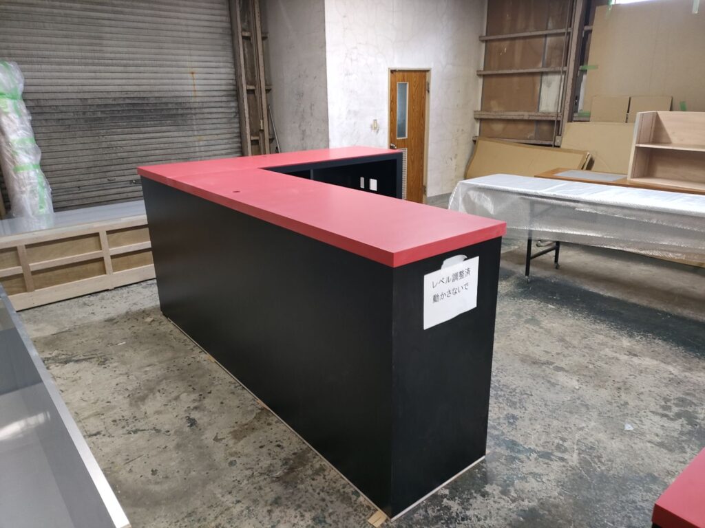 黒のメラミン化粧板で作った収納スペース付きの土台の上に、真っ赤な人工大理石を設置していく工程をアッセンブリー工場からお届けします。