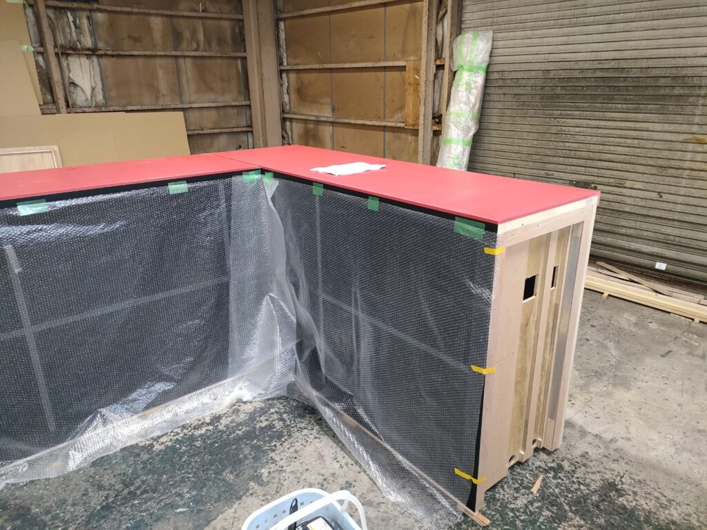 すっかり1枚のL型に仕上がった人工大理石の天板は、今回はベースの木工カウンターに取り付けて配送することになっています。