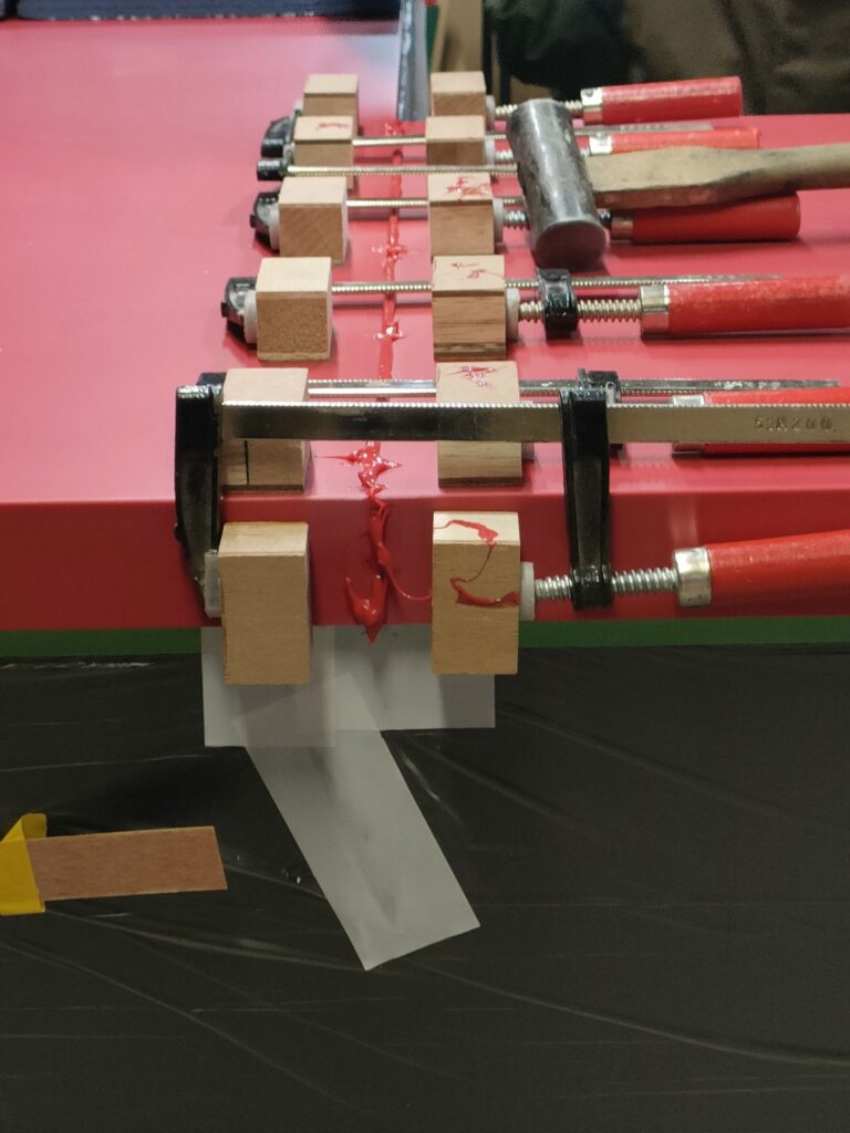 塗布の後は、人工大理石の天板に両面テープで木片を貼り付け、クランプを使ってしっかりと圧着していきます。