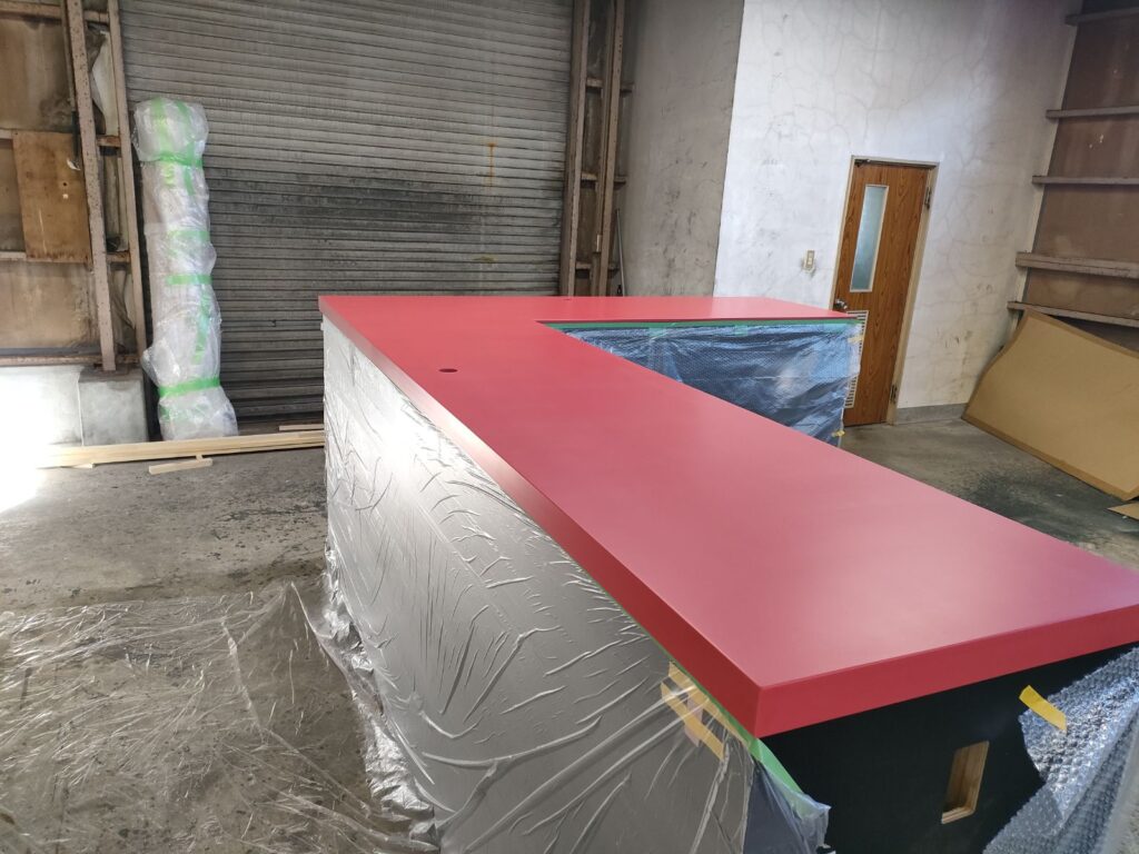 真っ赤な人工大理石天板×黒のメラミン化粧板を使った受付カウンター