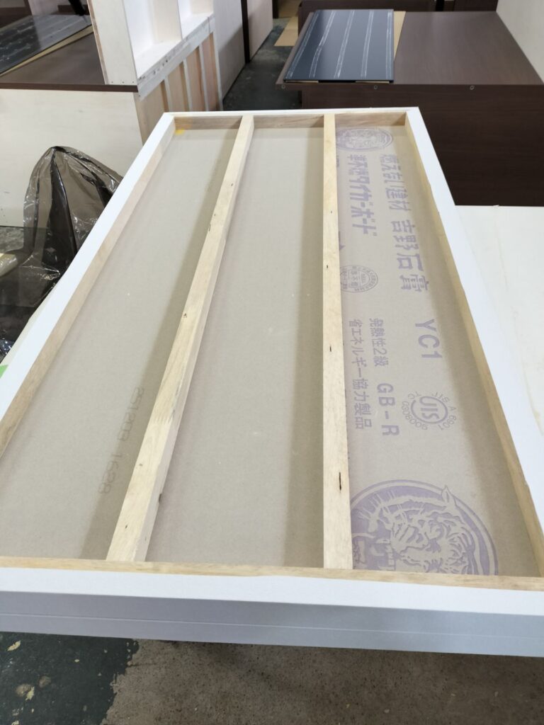 まずは木材下地を組み、石膏ボードをビス止めして剛性を確保します。