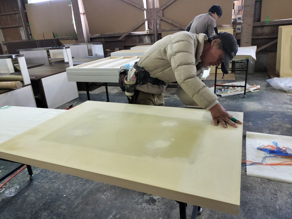 コレカでは、富山のアッセンブリーセンターで工程調整と品質管理を行い、最終仕上げのクロス貼りも職人さんと連携して対応しています。