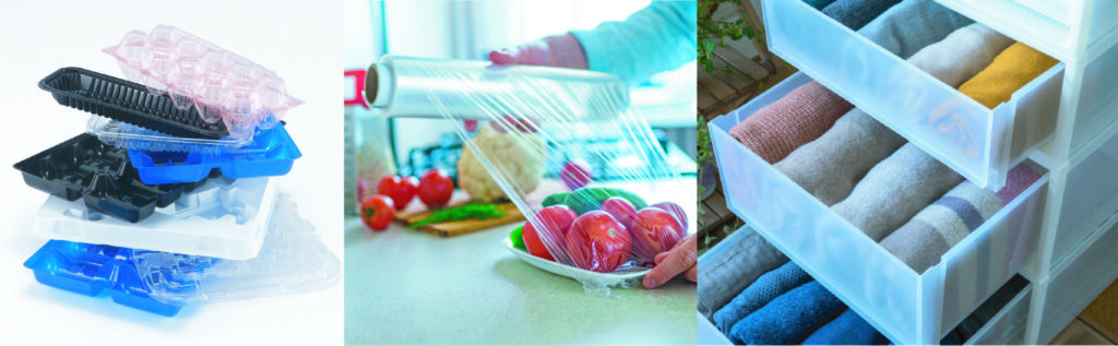 | ポリエチレン(PE) | 電気絶縁性、耐水性、耐寒性、耐薬品性が良い。無害・無毒で安全性に優れる。紫外線で劣化しやすい。 | ラップフィルム、包装材、洗面器、灯油缶、ビニールハウス、すべり台 |