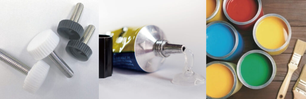 ネジの頭に使われるユリア樹脂(UF)や、材料の接着に使われるエポキシ樹脂(EP)系の接着剤、塗料、コーキング剤やパッキンに使われるシリコーン樹脂(SI)など、目立たないながらも什器の品質を支える重要な役割を担っています。