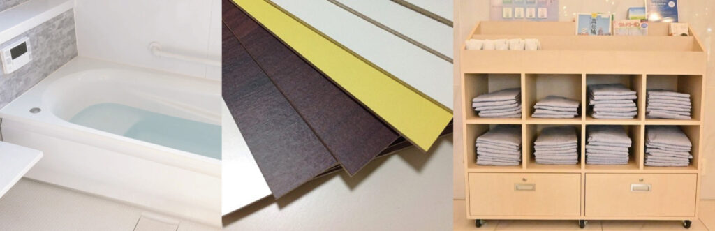 ガラス繊維で補強した繊維強化プラスチック(FRP)は、浴槽やボートなどに使われるほど高い強度を誇ります。什器では、合板と合わせた「ポリ合板」が棚板などに利用されます。