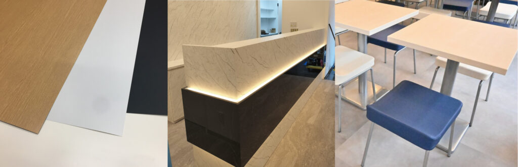 什器では、天板などに使われる「メラミン化粧板(熱硬化性)」や、日用品に多いポリプロピレン(熱可塑性)など、それぞれの特性を活かした使い分けがされています。