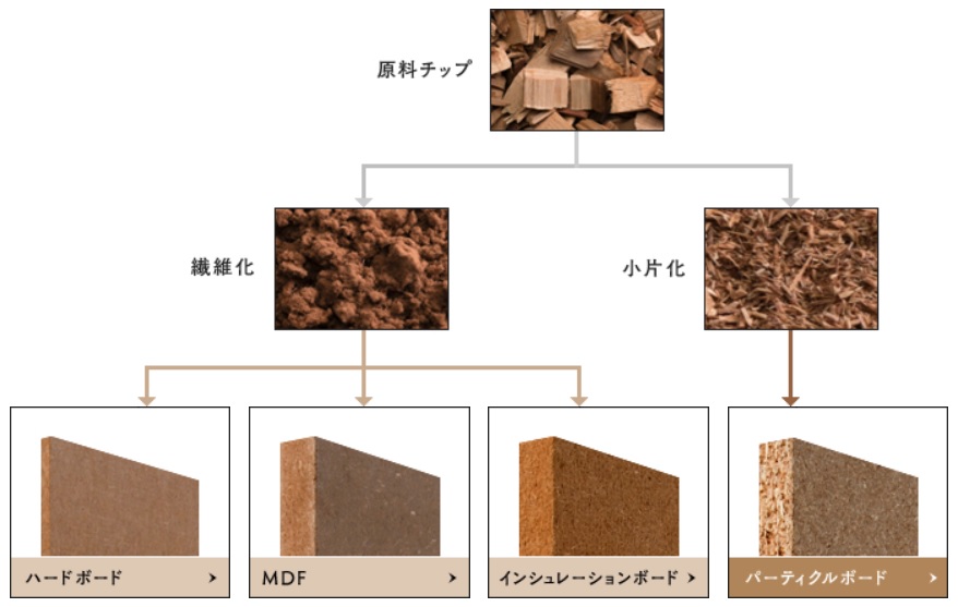 | 構造 | 単板を木目が直交するように積層 | 木材チップを圧縮成形 | 木材繊維を圧縮成形 |