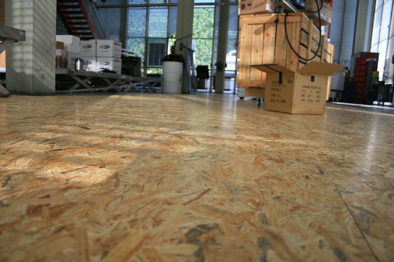 パーティクルボードの仲間で、木材のチップをより大きく削り、意図的に方向を揃えて(配向性)圧縮したものをOSB(Oriented Strand Board)と呼びます。