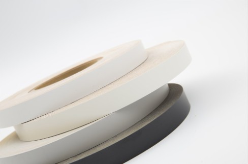 PVC(ポリ塩化ビニル)やABSなどの樹脂素材のテープを、手貼りまたは専用のエッジバンダーで圧着します。