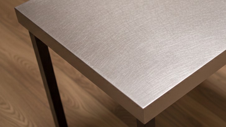 最もポピュラーで、汎用性が高い仕上げです。 髪の毛(Hair)のような細く長い筋目を一方向に通した加工です。金属特有の冷たさとシャープさを演出でき、照明の映り込みを適度に抑えます。