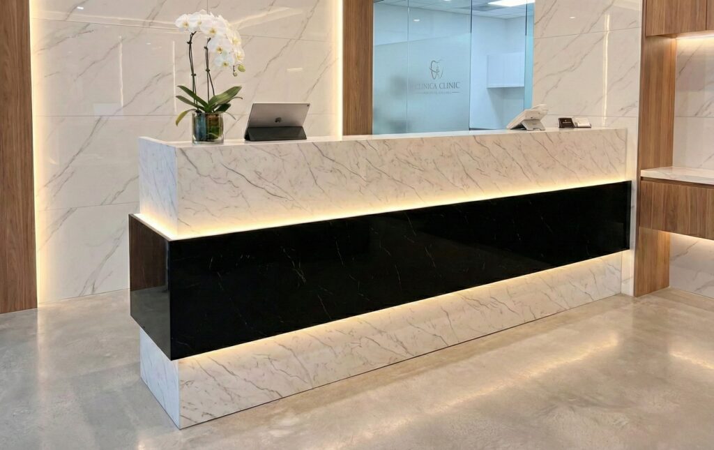 ジュエリーケースの天板や、フラットなレジ台で、とにかく高級感を出したい、かつメンテナンスを楽にしたい場合は人造大理石(クォーツストーン)が最適です。