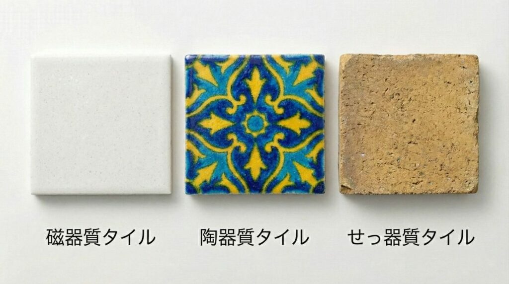 タイルは原料や焼成温度によって大きく3つに分類され、それぞれ吸水率や硬さが異なります。什器のどこに使うか(天板か、腰壁か)によって使い分けが必要です。