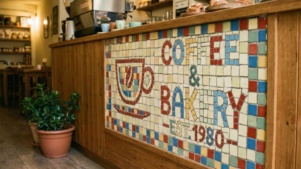 一辺が50mm以下の小さなタイル。シート状に連結されて販売されていることが多く、R(曲面)のカウンター腰にも施工しやすいのが特徴です。色の違うタイルを組み合わせて「店舗のロゴ」や「サイン(文字)」を描く手法も人気です。カッティングシートにはない、レトロで可愛らしい雰囲気を演出できます。