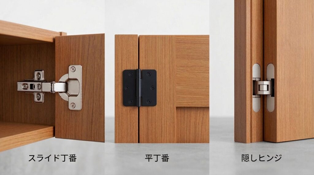 スライドヒンジには「90度開き」「105度開き」「170度開き」など様々な種類があります。通路が狭い店舗で大きく開く扉にしてしまうと、通行の妨げになります。レイアウトに合わせて「どこまで扉が開くべきか」を逆算して丁番を選ぶのがプロの設計です。