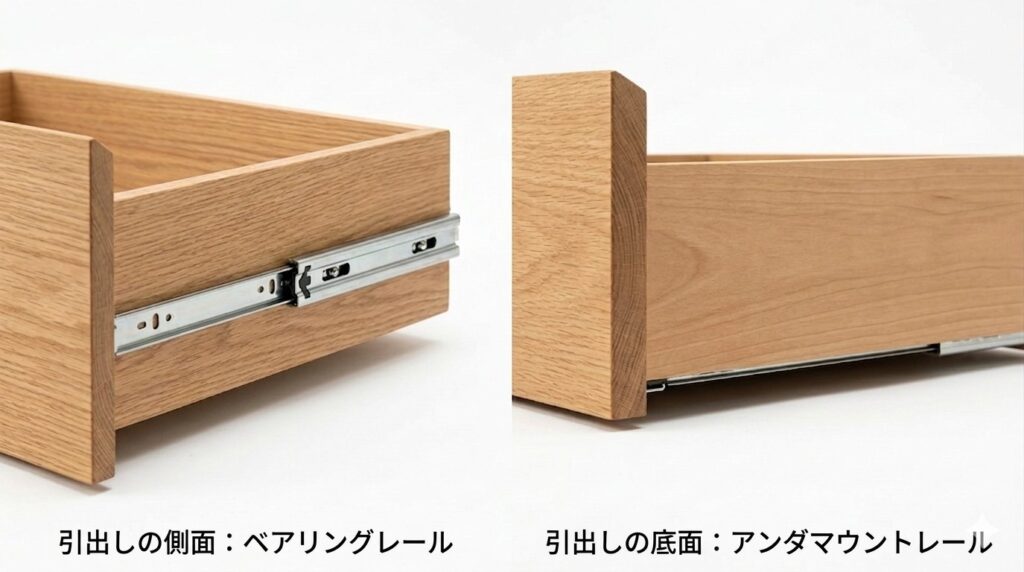 多数の金属ボール(ベアリング)が内蔵されており、動きが非常に滑らかです。「3段引き」は引出しを奥まで完全に引き出せるため、奥の物が取り出しやすく、什器製作ではこれが最も標準的に使われます。 - アンダーマウントレール