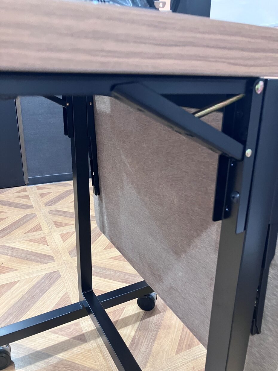 そこに折りたたみ式の棚受けを取り付け、天板を固定して折り畳みのできるデスクにしています。