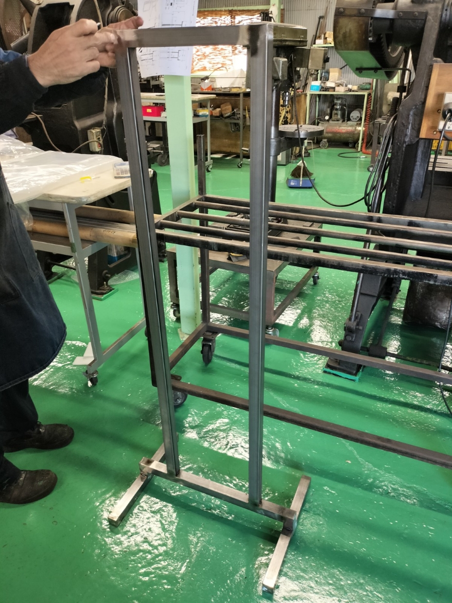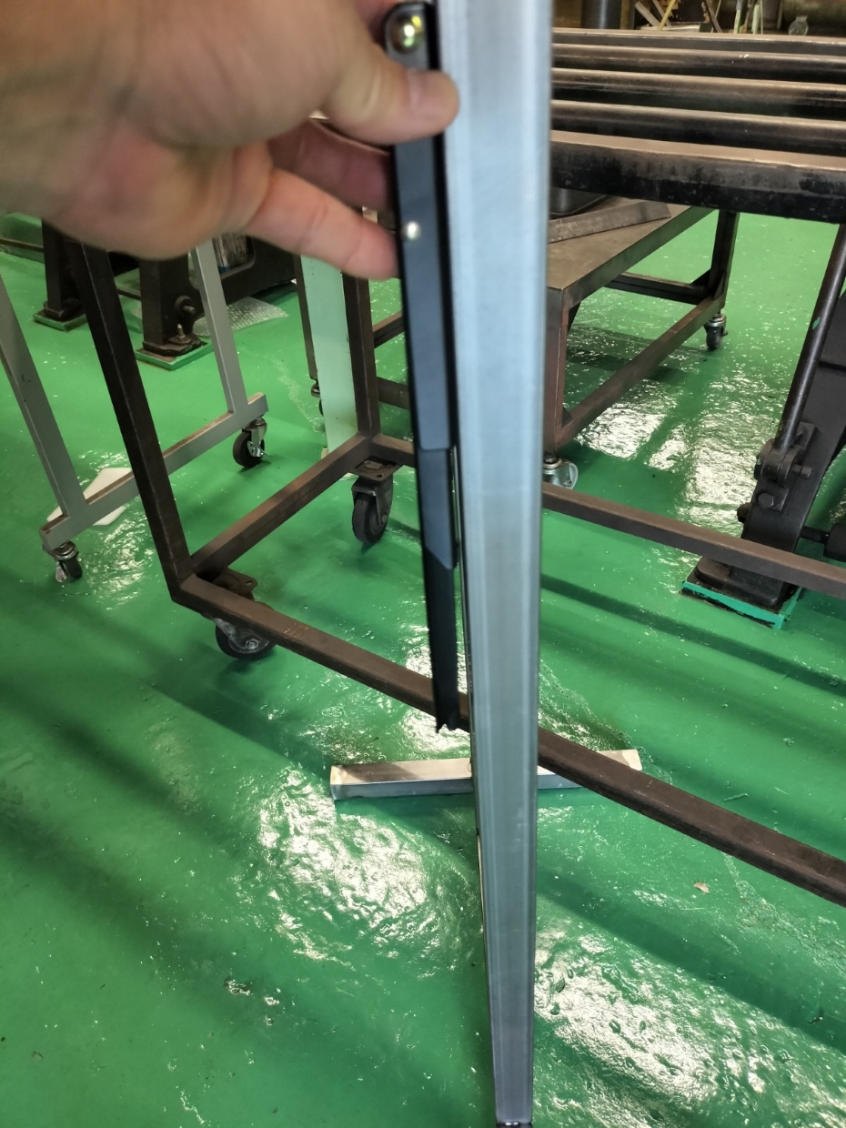 従来のような“脚と天板を組み合わせたデスク”ではなく、スチール角パイプを看板のように組み上げたキャスター付きのベースを採用。