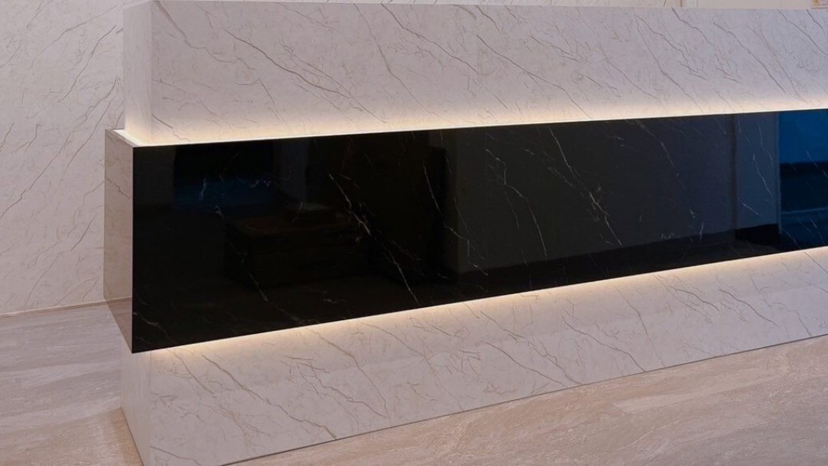 高級感と実用性を兼ね備えた、大理石調受付カウンター