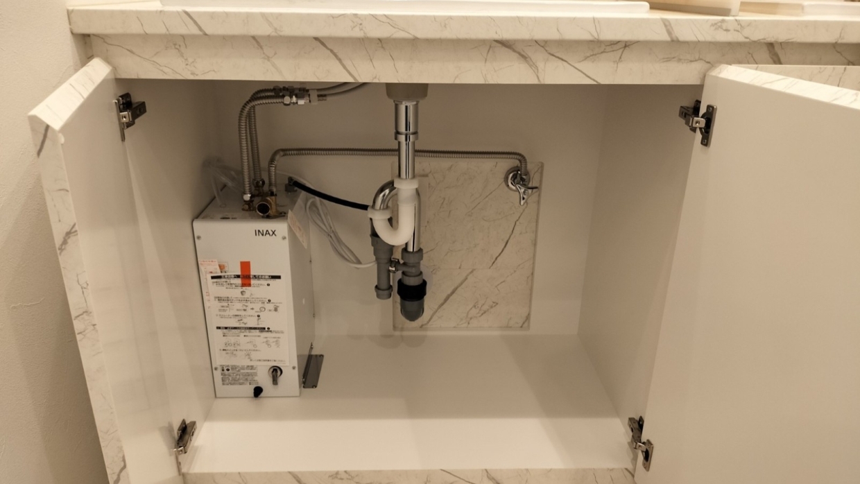 工場で製作する際に、現場の給排水管の位置に合わせてカウンターの背板の一部を切り欠いて製作しました。
