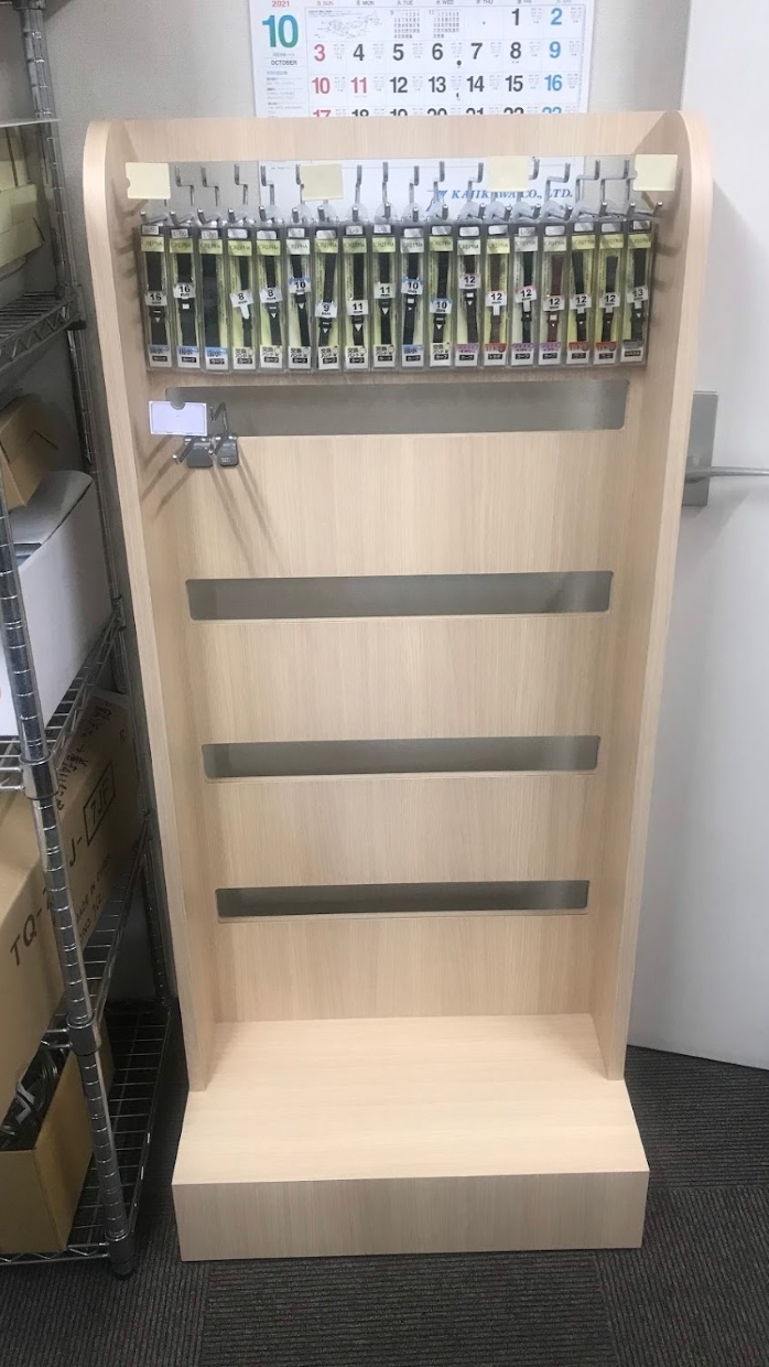 限られたスペースの中で、できるだけ多くの商品を無駄なく陳列できるよう、フック位置やピッチを細かく調整しています。