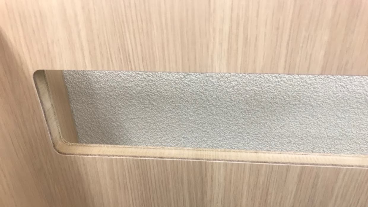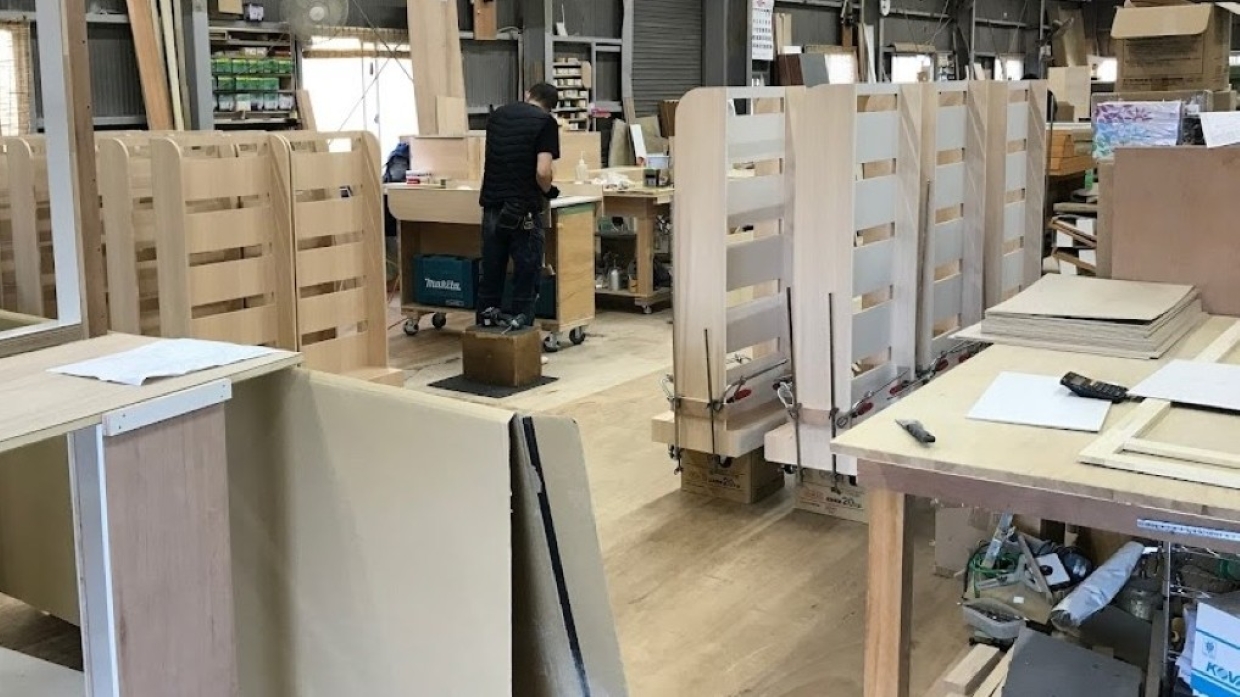コストを抑えたいというご要望に合わせ、見える部分には木目柄のポリ合板を、背面などの見えない部分には白ポリ合板を使用しました。