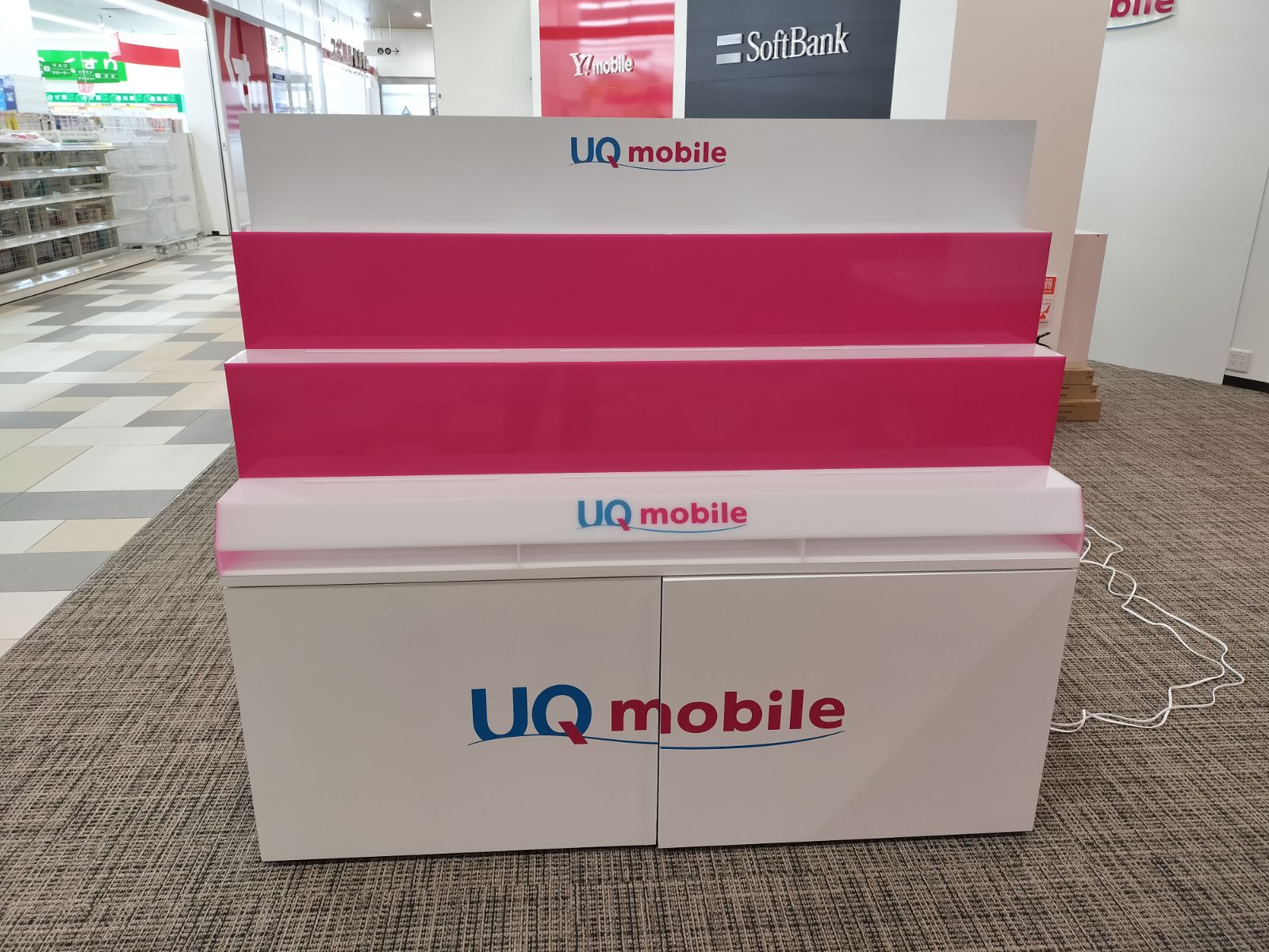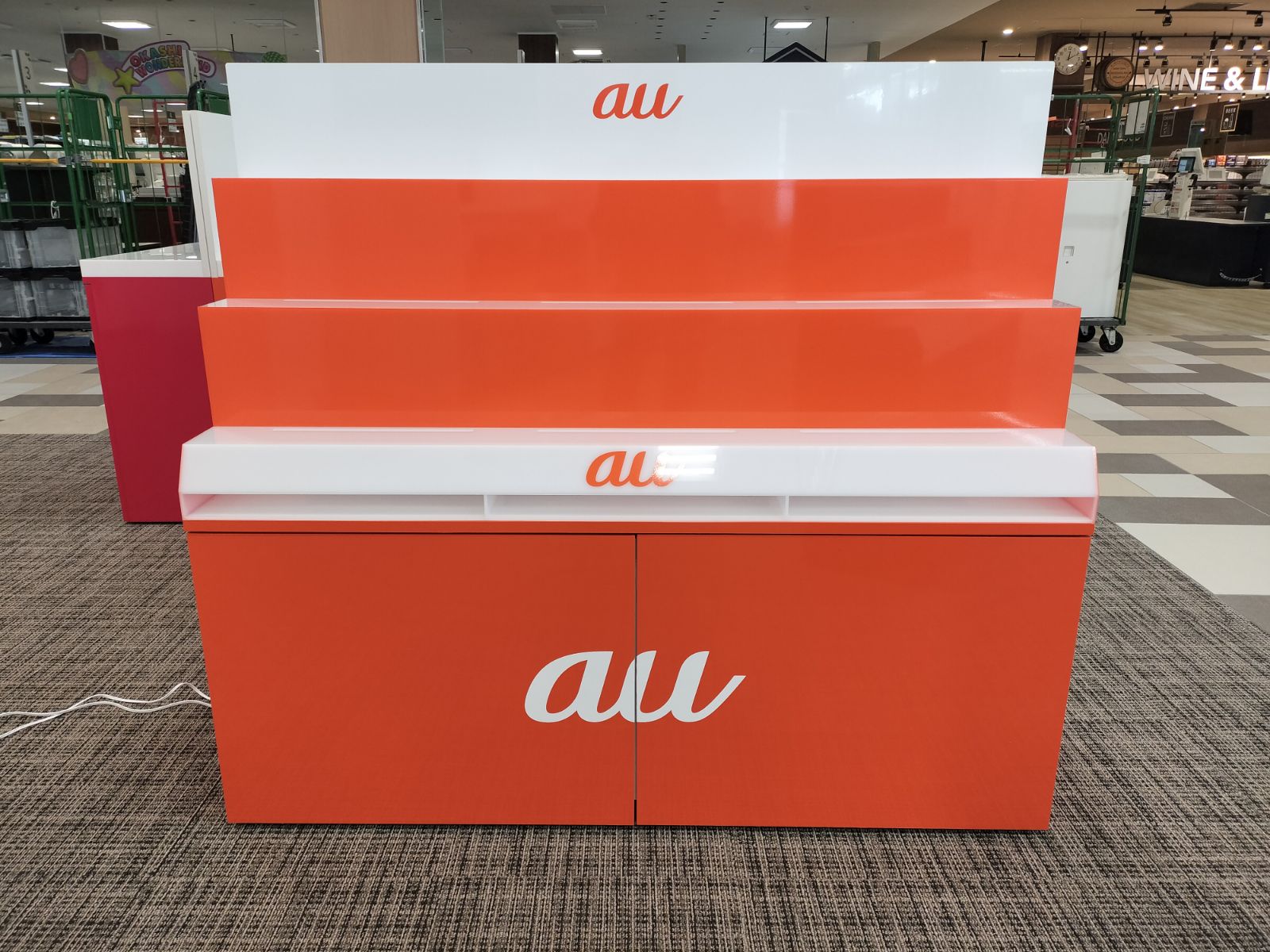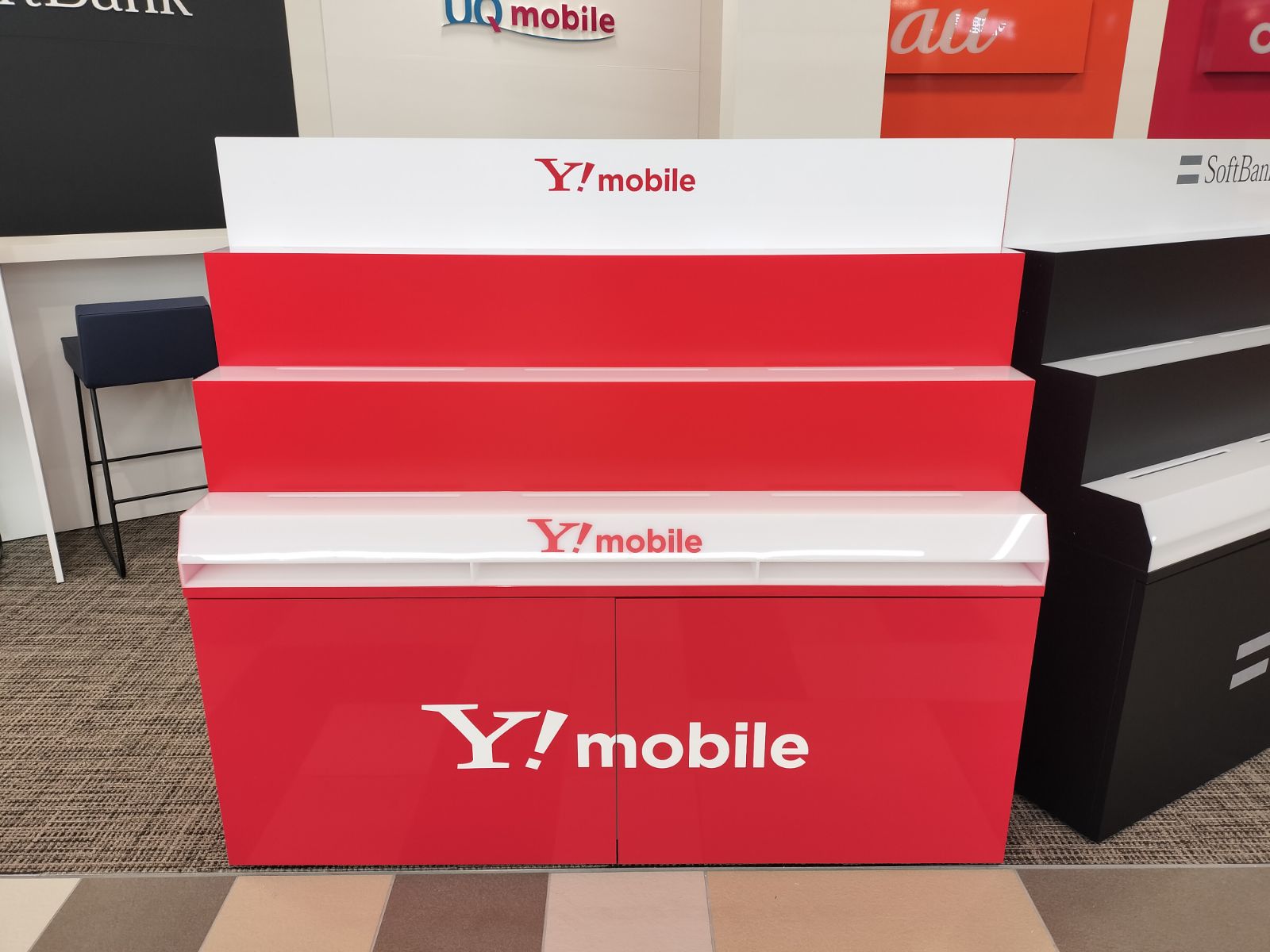 什器の土台(下台)はしっかりとした木製で製作し、表面には各キャリアのブランドカラーに合わせた化粧シートを丁寧に貼り込んでいます。統一感のある鮮やかな発色で、広大な売り場の中でもブランドの存在感をしっかりとアピールします。